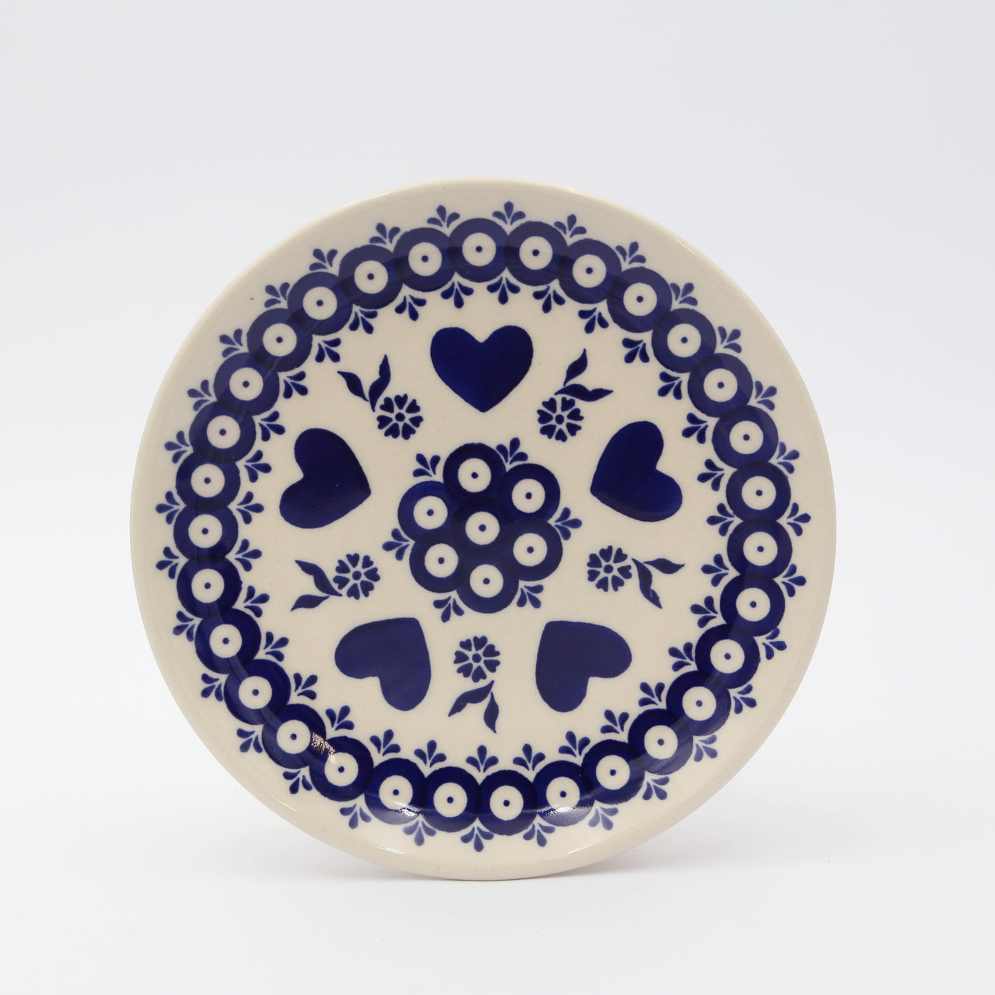 Dekoracja Piernikowe Serce to opowieść zamknięta w kobalcie i kremie. W centralnym punkcie rozkwita kwiatowy ornament, otulony sercami niczym czułe wspomnienia świątecznych chwil. Drobne gałązki i subtelne detale wiją się wokół, tworząc harmonijny taniec tradycji i rzemiosła. Obrzeże naczynia zdobi rytmiczny wzór pierścieni i listków, przywodzący na myśl ciepło domowego ogniska i kunszt bolesławieckiej ceramiki.
